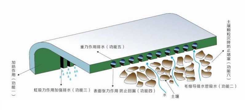 本產(chǎn)品采用PVC高密度聚合材料,具有較好的韌性,埋于土中可以起到拉結土壤的作用(功能一);且一反傳統(tǒng)改采用密集溝槽,內(nèi)大外小的設計,且埋設時溝槽面向下,而使水流由下往上倒吸進入毛細導水管(功能二);如此一來土壤顆粒因重力自然沉淀不致隨同水流進入毛細導水管內(nèi),同時也不會在進水槽溝附近產(chǎn)生淤積現(xiàn)象(功能三);但是內(nèi)部溝槽既能進水,同時也造成漏水之后果,此時毛細防排水板則利用表面張力使水在溝槽上產(chǎn)生封閉效果不回漏(功能四);當水進入時,毛細現(xiàn)象會自然而然對土壤中的水分產(chǎn)生抽吸的效果,直到灌滿并以重力流向外排放(功能五);當水流到達出口將因落差產(chǎn)生虹吸作用,進一步對土壤內(nèi)部產(chǎn)生負壓,大幅增加吸排水效果(功能六)。